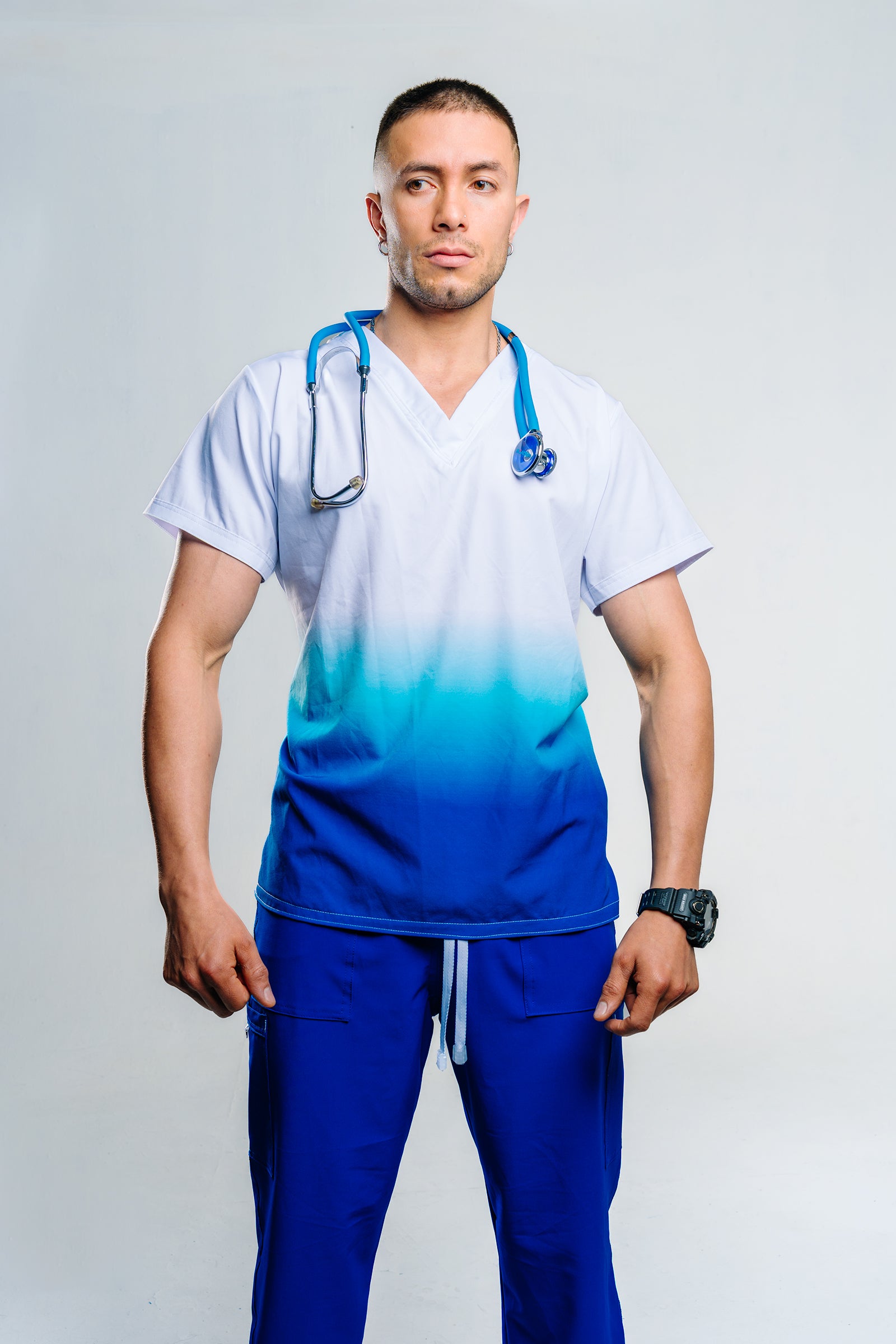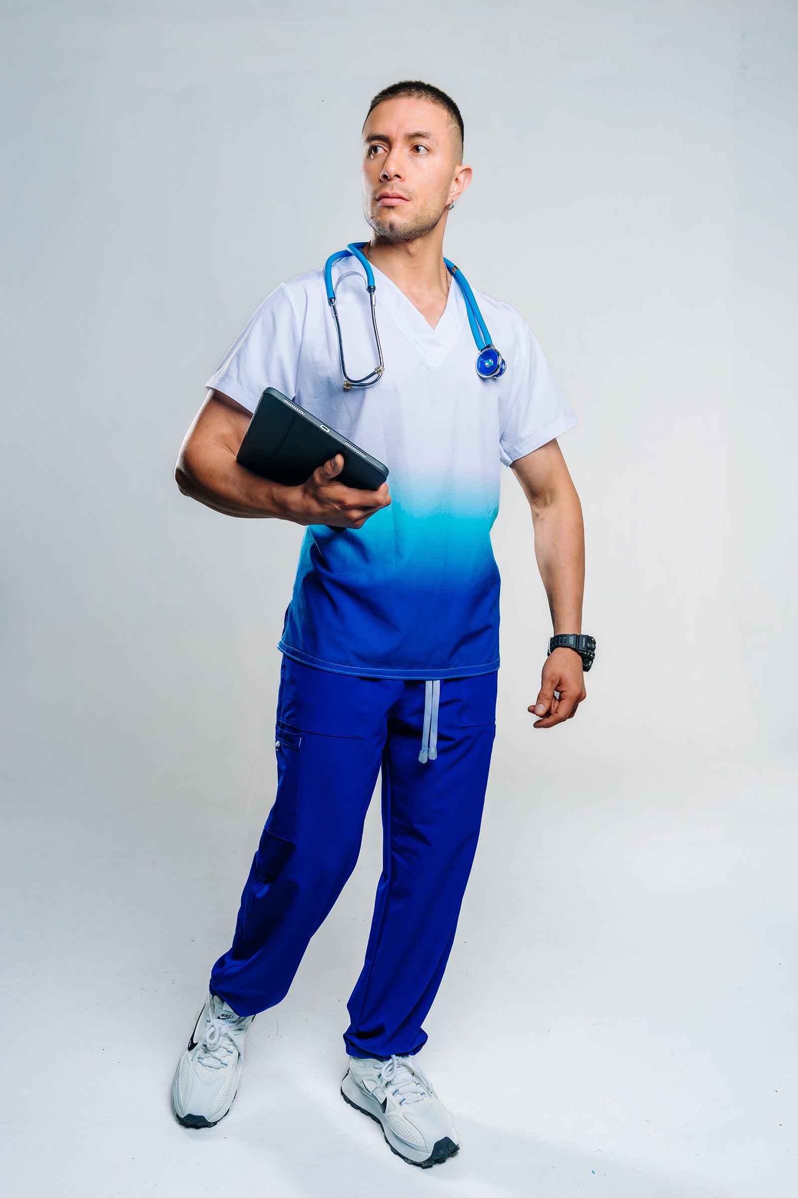 Palabras clave integradas: uniforme degradé galaxy, prenda cuello caja, uniforme con bolsillos internos, ropa antifluido moderna, diseño profesional.
