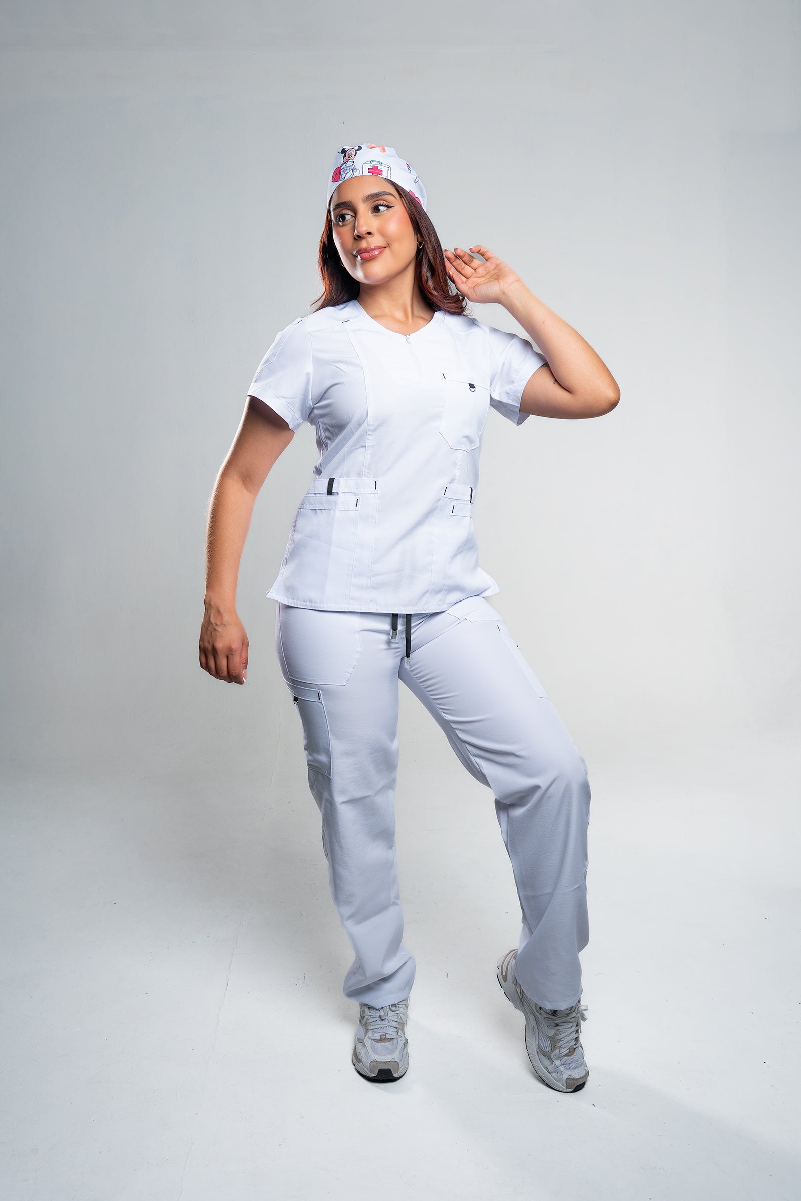 Comodidad, funcionalidad y diseño profesional en una sola pieza. Esta prenda destaca por su cuello V redondo en punta, que estiliza y aporta elegancia, además de detalles con falsos internos que ofrecen un acabado más estructurado. Sus múltiples bolsillos están estratégicamente ubicados para máxima practicidad, y las presillas negras refuerzan el diseño utilitario con un toque sofisticado.