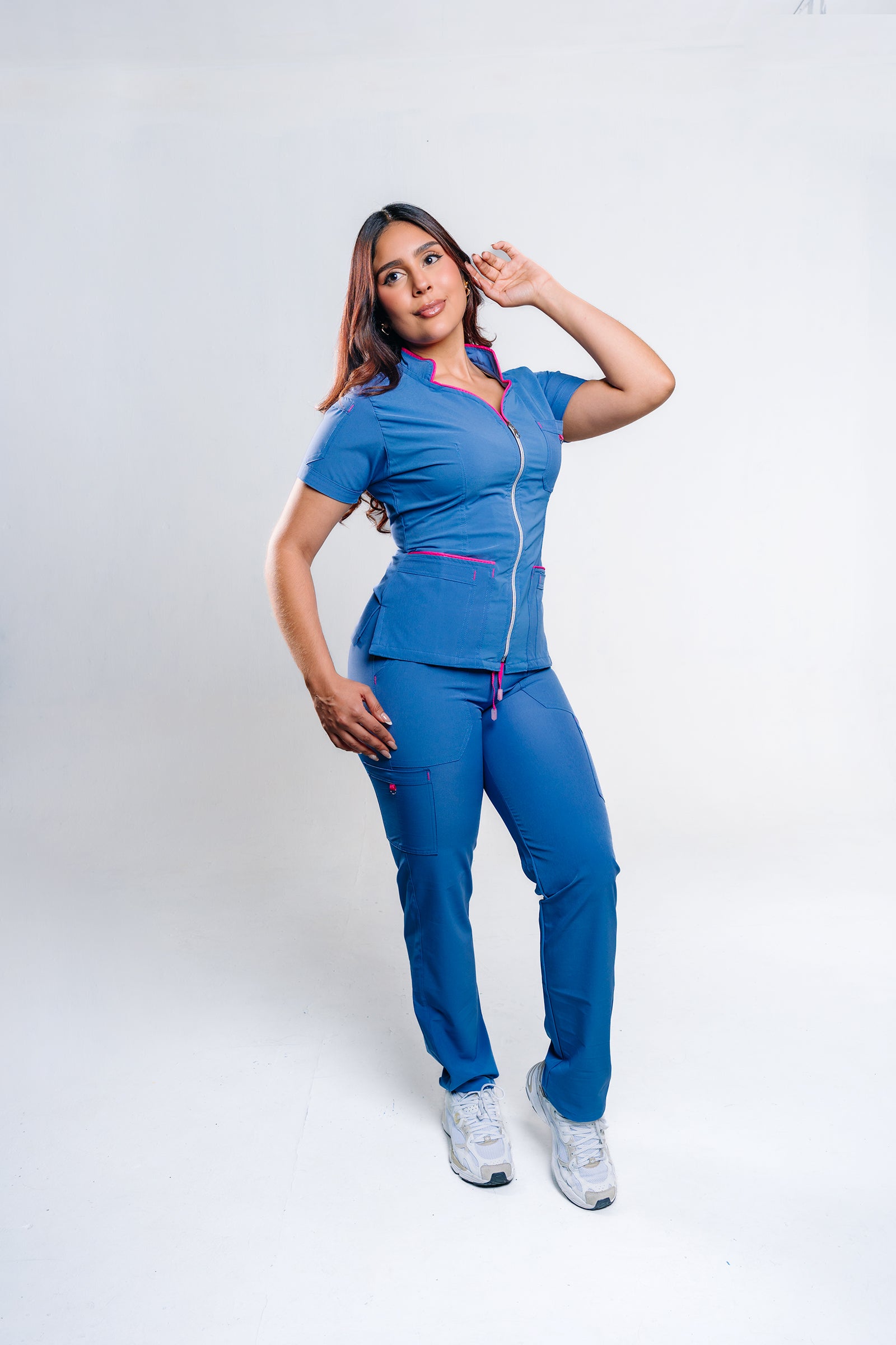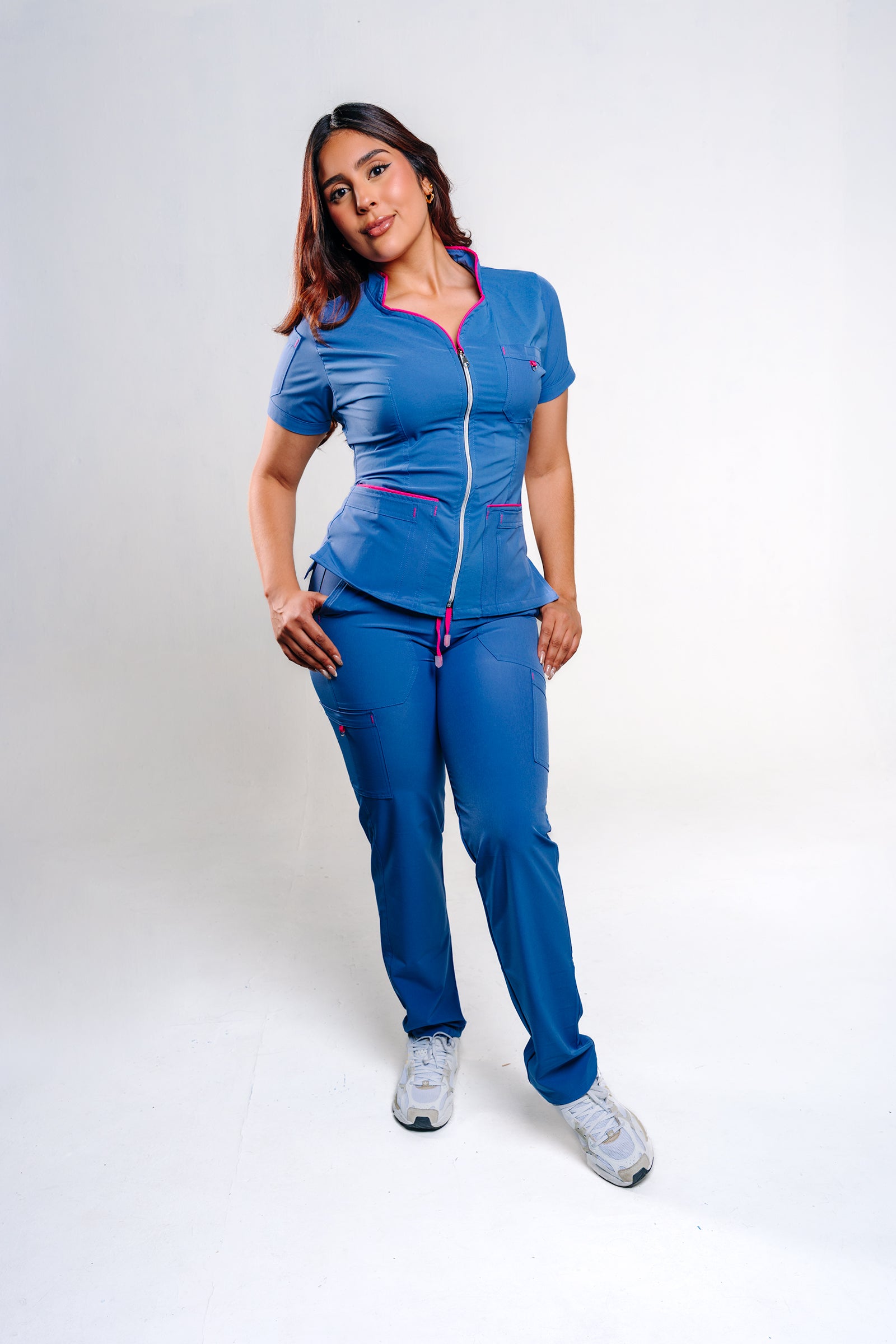 Elegancia y funcionalidad se combinan en esta prenda diseñada para destacar. Su cuello militar tipo corazón aporta un toque sofisticado y moderno, mientras que el cierre plateado entero asegura practicidad y estilo. Los múltiples bolsillos funcionales brindan organización en todo momento, y los envones en tono fucsia añaden un contraste vibrante que marca la diferencia. Perfecta para profesionales que buscan imagen, comodidad y rendimiento.